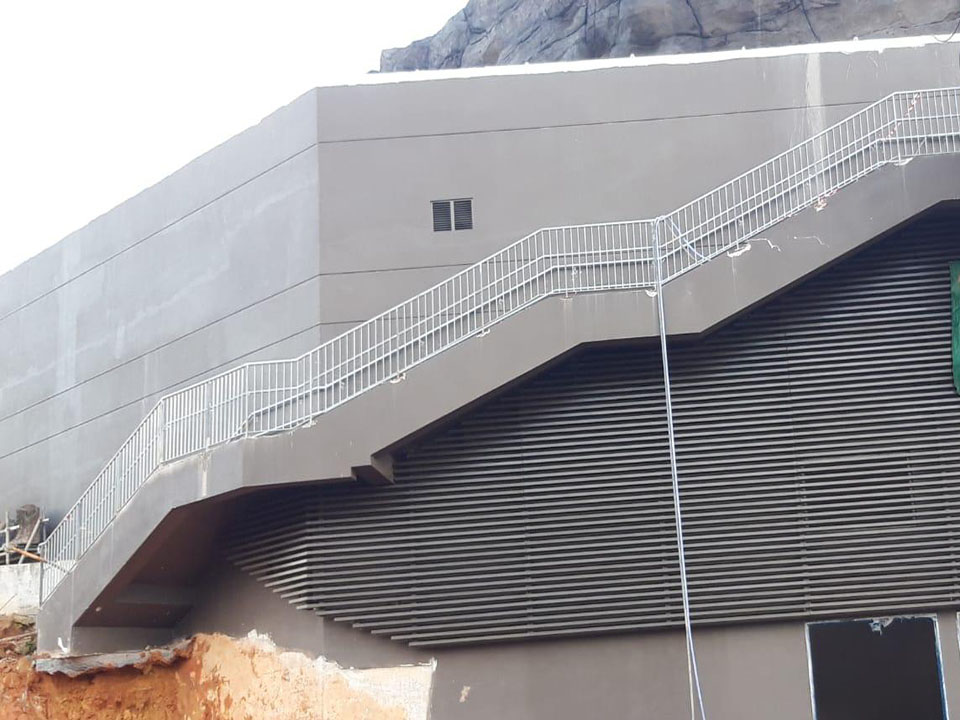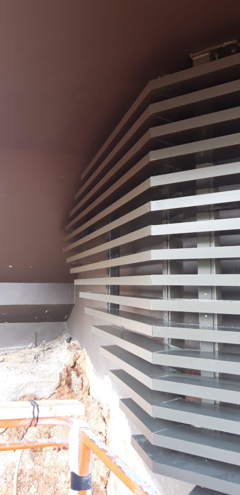 Steel subframe, Down hang alum screen and staircase vertical screen